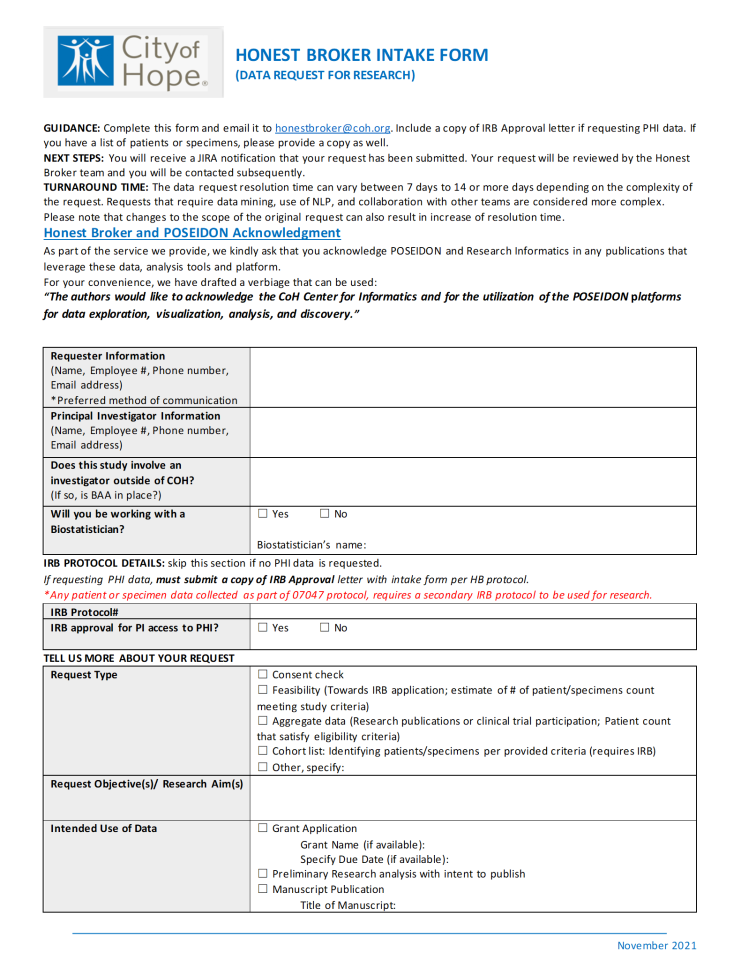 Step 3: Submit request (email the intake form to honestbroker@coh.org).
